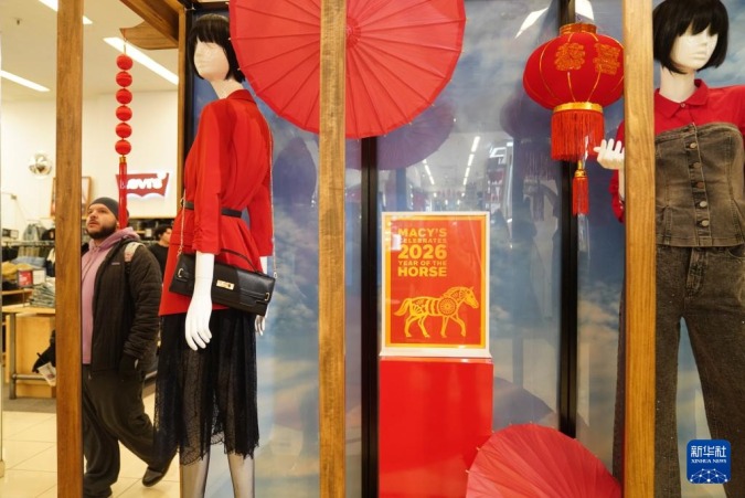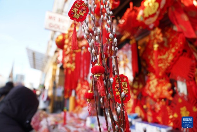 近日,在美国纽约皇后区法拉盛,春节主题装饰和商品在一些商场和街边商铺出现,增添了喜庆的节日氛围。