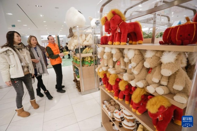 2月4日,在加拿大温哥华一家百货商店,顾客选购马年毛绒玩具。新华社发(梁森摄)