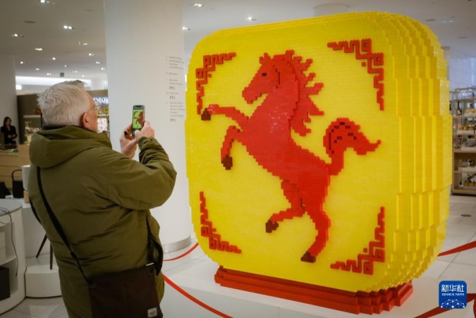 2月4日,在加拿大温哥华一家百货商店,顾客拍摄马年乐高积木装置。新华社发(梁森摄)