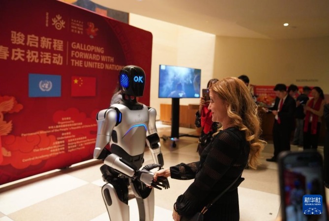 2月9日,在联合国总部举行的“骏启新程”新春庆祝活动上,一名嘉宾和机器人握手。新华社记者 张凤国 摄
