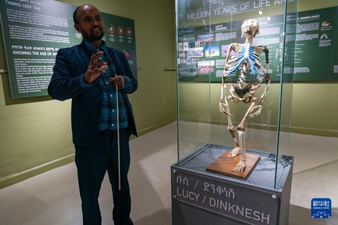 2月12日,在埃塞俄比亚首都亚的斯亚贝巴的埃塞俄比亚国家博物馆内,工作人员讲解露西化石的相关知识。新华社记者 谢剑飞 摄