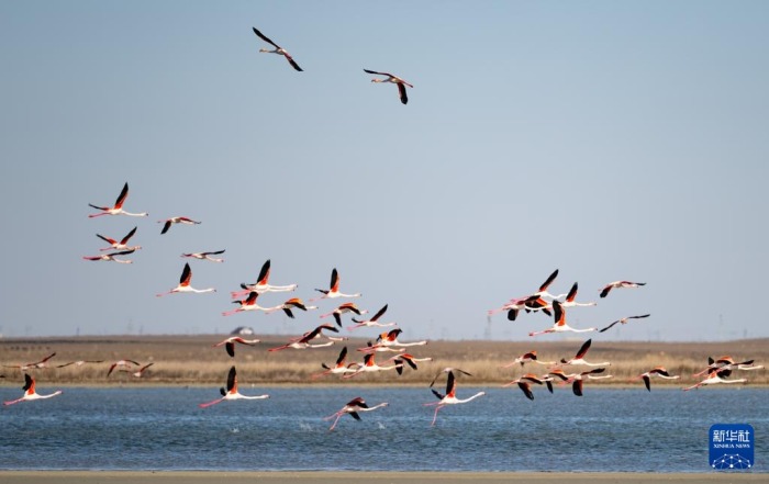 3月10日,在哈萨克斯坦曼格斯套州阿克套市郊,火烈鸟在卡拉科尔湖飞翔。新华社记者 李任滋 摄