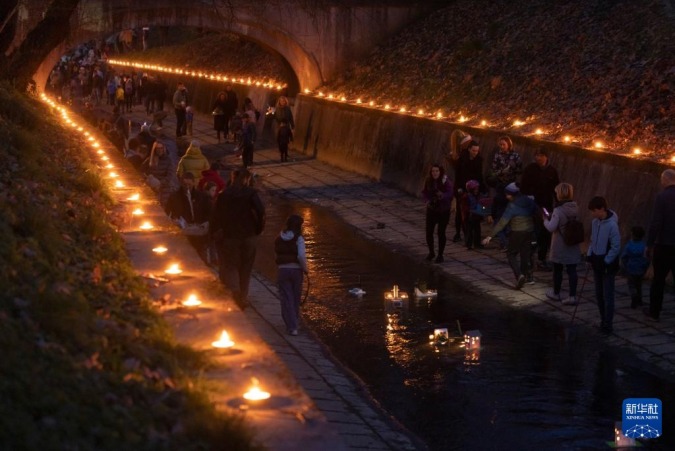 3月11日,在斯洛文尼亚卢布尔雅那,人们将自制的小船放在溪流中。新华社发(泽利科·斯特凡尼奇摄)